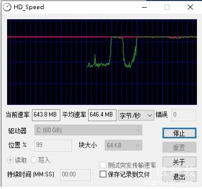 hd_speed測試系統(tǒng)虛擬盤的速率(服務(wù)器網(wǎng)卡的發(fā)送速率)600M/s~650M/s之間。