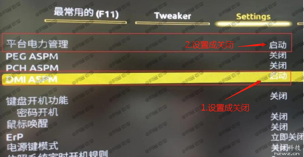 bios 中settings- DMI-ASPM 設置成"Disabled" 為關閉 (一般主板只關閉這項即可,如不行可繼續(xù)以下設置)